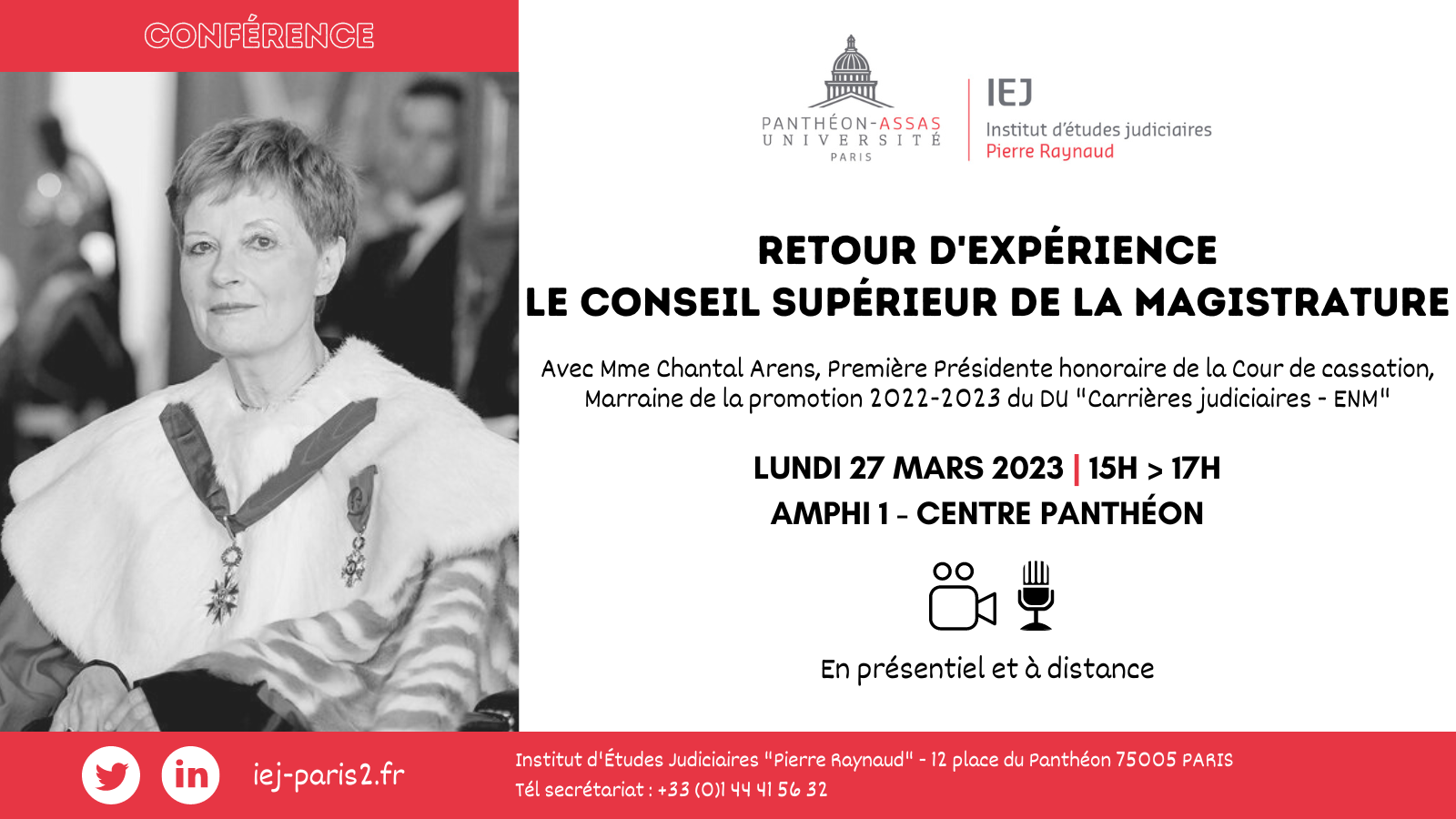 Conférence exceptionnelle de Mme Chantal Arens, Première Présidente honoraire de la Cour de cassation, Marraine de la promotion 2022-2023 du DU "Carrières judiciaires - ENM