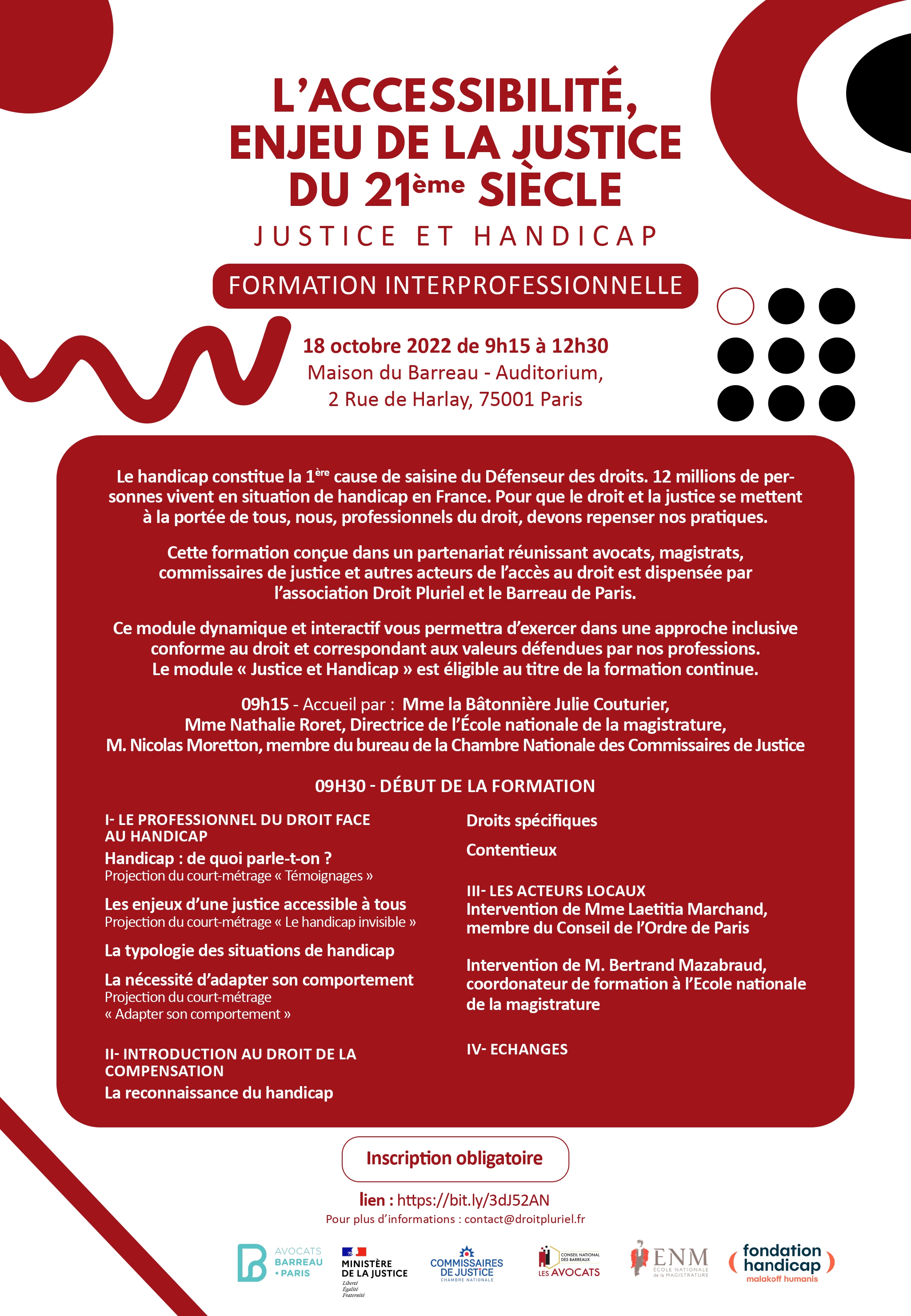 Pour y participer : https://www.avocatparis.org/agenda-des-formations/justice-et-handicap-laccessibilite-enjeu-de-la-justice-du-21eme-siecle